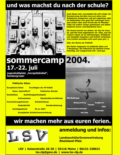Das achte Sommercamp der LSV fand vom 17.-22. Juli 2004 auf dem Jugendzeltplatz "Herrgottshübel" in Homburg-Jägersburg mit einem gewohnt reichhaltigen politischen und kulturellen Programm statt.