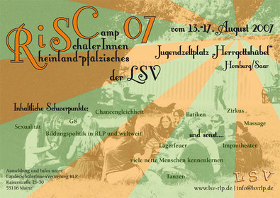 Das insgesamt 11. Sommercamp der LSV unter dem Motto "risc07 - rheinland-pfälzisches SchülerInnenCamp" wird im Jahre 2007 auf dem Jugendzeltplatz "Herrgottshübel" bei Homburg/Saar stattfinden.