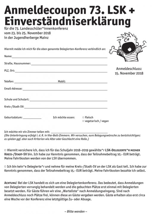 Auf unserer Homepage findet ihr auch den Anmeldecoupon, der gleichzeitig als Einverständniserklärung fungiert. Diesen müssen alle Unter-18-Jährigen von einer/einem Erziehungsberechtigten unterschreiben lassen und an unser Büro schicken oder spätestens zur LSK selbst mitbringen.