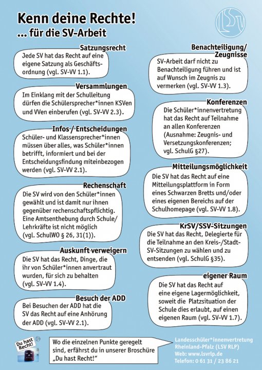 Die neuen Schüler*innenrechte-Plakate finden sich online unter: https://www.lsvrlp.de/de/article/3936.neues-sv-rechte-plakat-kenn-deine-rechte.html