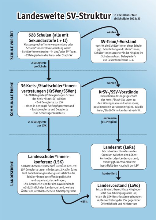 Achtung: Anträge an die LSK können alle Schüler*innen in Rheinland‐Pfalz stellen; auf der LSK stimmberechtigt sind allerdings NUR Menschen, die auf einem Treffen ihrer Kreis‐ oder Stadt‐SV als Delegierte zur LSK gewählt wurden, NICHT Vertreter*innen einzelner Schulen (siehe auch die Erläuterungen zur LSV‐Struktur)!