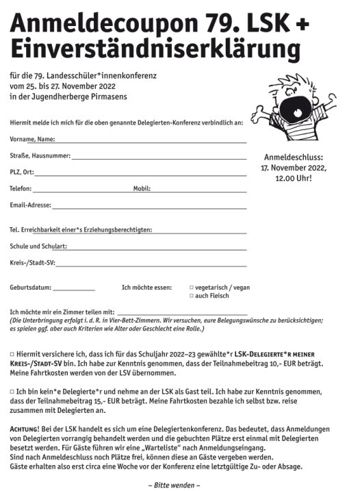 Auf unserer Homepage findet ihr auch den Anmeldecoupon, der gleichzeitig als Einverständniserklärung fungiert. Diesen müssen alle Unter‐18‐Jährigen von einer*einem Erziehungsberechtigten unterschreiben lassen und an unser Büro schicken oder spätestens zur LSK selbst mitbringen. Volljährige können/müssen diesen selbst unterschreiben und abgeben.