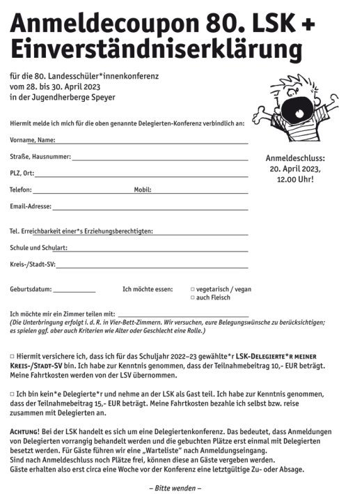 Auf unserer Homepage findet ihr auch den Anmeldecoupon, der gleichzeitig als Einverständniserklärung fungiert. Diesen müssen alle Unter‐18‐Jährigen von einer*einem Erziehungsberechtigten unterschreiben lassen und an unser Büro schicken oder spätestens zur LSK selbst mitbringen. Volljährige können/müssen diesen selbst unterschreiben und abgeben.