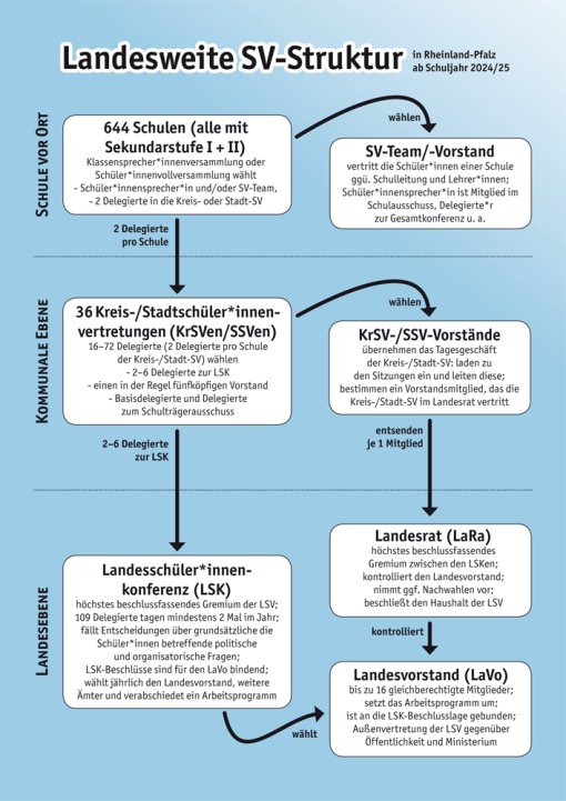 Die LSK setzt sich aus den Delegierten der 36 Kreis‐ und Stadt‐SVen in Rheinland‐Pfalz zusammen. Ihr trefft euch also in eurer Kreis‐ oder Stadt‐SV und wählt dort die Menschen, die euren Kreis oder eure Stadt auf Landesebene vertreten sollen. In den meisten der Kreis‐ und Stadt‐SVen sollte dies für das Schuljahr 2023/24 bereits geschehen sein. Falls nicht, findet ihr die Einladung zu eurer nächsten Sitzung über die interaktive Rheinland‐Pfalz‐Karte oder die Terminliste auf unserer Homepage.
