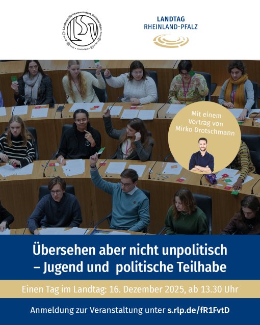Das politische Interesse junger Menschen wächst – doch ihre Stimmen werden im öffentlichen Diskurs nicht immer ausreichend gehört. Genau hier setzt unsere gemeinsame Veranstaltung an: Wir wollen über die politische Teilhabe von Jugendlichen sprechen und Wege finden, wie junge Stimmen mehr Gewicht bekommen können. Neben einem spannenden Vortrag von Mr. Wissen2Go erlebst du den Landtag Rheinland-Pfalz hautnah von innen: Du lernst den Plenarsaal kennen, triffst den Landtagspräsidenten und kannst Politik einmal direkt dort erleben, wo sie gemacht wird.