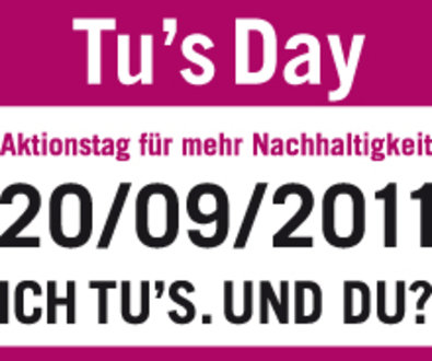 "Ich tu's. Und du?" Unter diesem Motto startet die Initiative "Mehr wissen! Mehr tun!" am 20. September 2011 erstmals einen bundesweiten Aktionstag, der SchülerInnen ermutigen will, sich mit Fragen der Nachhaltigkeit zu befassen. Anlass ist die Aktionswoche der UN-Dekade "Bildung für nachhaltige Entwicklung", die vom 16. bis 25. September in ganz Deutschland stattfindet. Gefördert wird der "Tu's Day" von der Deutschen Bundesstiftung Umwelt (DBU). Kooperationspartner des bundesweiten Aktionstages ist Schüler VZ.