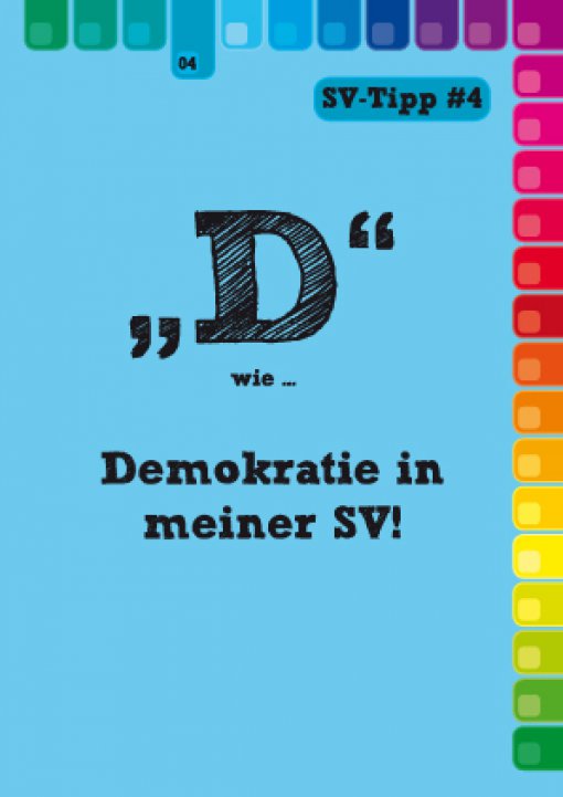 Lasst die SchülerInnen an der demokratischen Gestaltung teilhaben! Demokratie ist nicht nur die theoretische Möglichkeit mitzumachen, sondern auch die praktische Umsetzung. Gebt ihnen die Möglichkeit sich zu informieren (z. B. Aushängen der Protokolle und neuesten Infos im SV-Kasten, Bekanntmachung auf einer SV-Homepage, etc), mitzureden (regelmäßige KSVen, SV-Sprechstunden oder SV-Briefkasten) und mitzugestalten (z. B. Arbeitsgemeinschaften oder Diskussionsabenden).